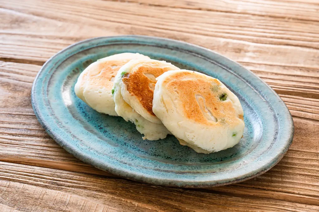 米粉生地に練り込んだ枝豆が見た目のアクセントに。フライパンで焼くことで、外は香ばしく、中はもっちりとした食感に。豆腐入りなので後味は軽やかです。今回はツナマヨとチーズを生地で包みましたが、混ぜ込んでもOK。ひじきの煮物など和の具材とも相性抜群です。