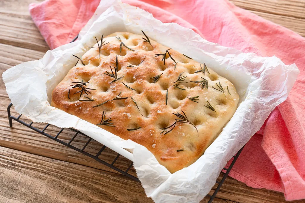 3. 発酵した生地に指で軽く穴をあけ、表面にオリーブ油を塗る。仕上げに岩塩とローズマリーを適量ちらし、200℃に予熱したオーブンで焼き色がつくまで15〜20分程度焼く。