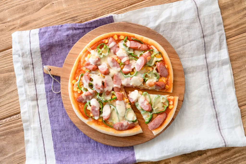 香ばしく焼き上げた生地に、ソーセージのうまみとケチャップ&マヨネーズのソースのコクがしっかり絡む、ボリューム感のある一枚。コーンもトッピングすれば、お子様も大よろこび! 生地だけを焼いて野菜やハムをのせてサラダピザにするのもおすすめです。