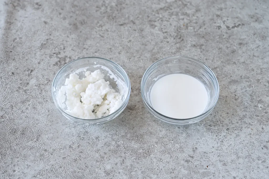 本記事ではパン用のミズホチカラを使用していますが、同じパン用のミズホチカラであっても、メーカーによって粉の挽き方などが異なるため、吸水率も変わってきます。右のように、粉を同量の水で溶いたとき、かたまらずにサラッとするタイプの米粉を選ぶと、作りやすくなります。