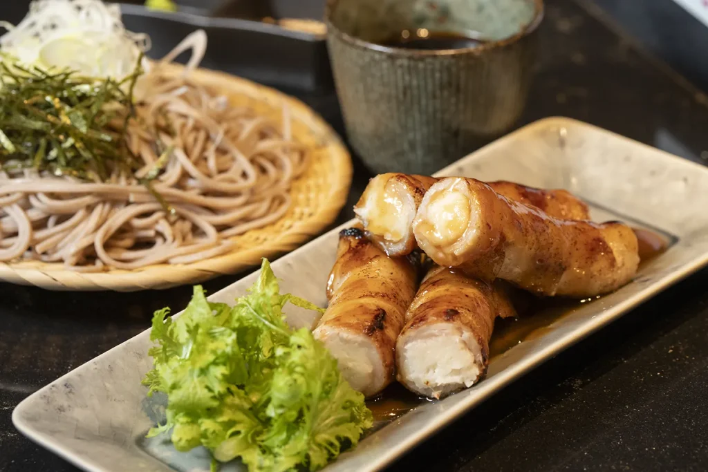 米粉で作った大根もちを豚バラ肉で巻いた一品。軽やかな口当たりに、ほわっとやわらかく、もちもち、しゃりっとした食感が重なり、大根の甘みも感じられます。自家製の甘辛すき焼きだれの餡が味をまとめ、箸が止まらないおいしさです。