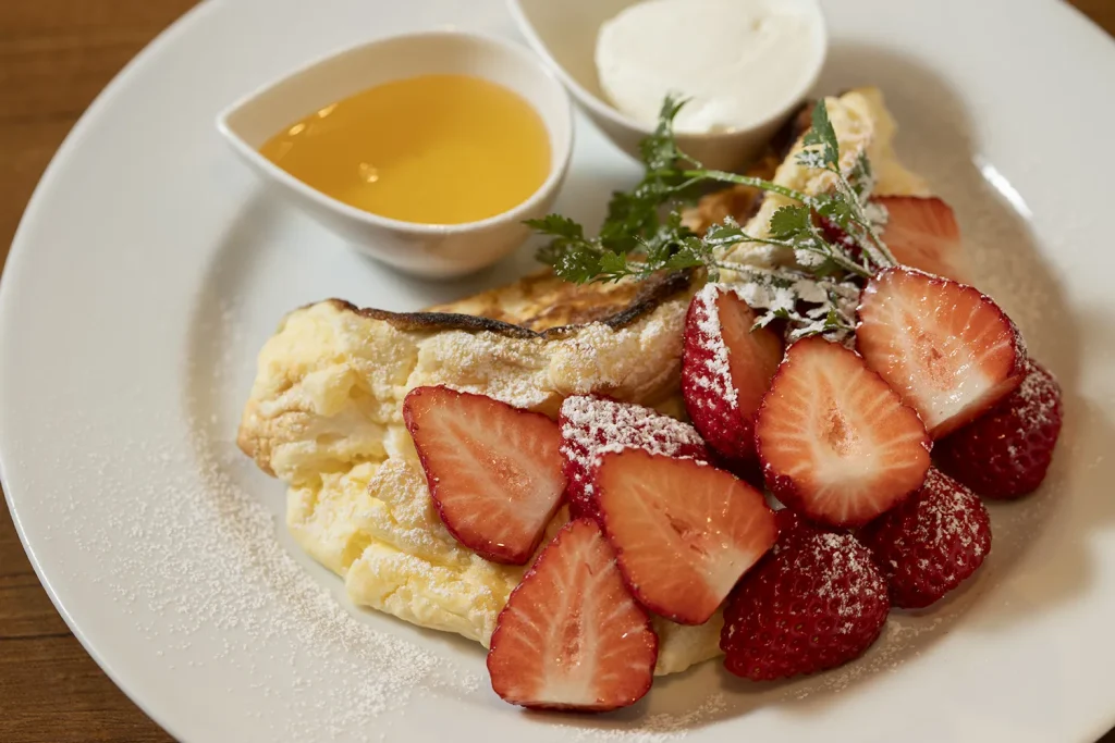 パンケーキ生地には米粉を使用。シェフが生み出した、きめ細かく、もちもちふかふかのスフレ生地が、いちごの風味をやさしく引き立てます。