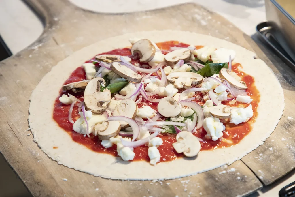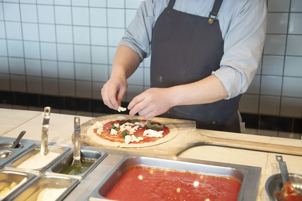 レジで「米粉のクリスピーマルゲリータ」を注文し、カスタムスタート。今回はおすすめのトッピングである赤たまねぎ、マッシュルーム、生ハムの3種類を選びました。マルゲリータベースに赤たまねぎとマッシュルームをのせ、お店の名の由来でもある華氏800度の高温石窯へ。約90秒で一気に焼き上がる様子は、見ているだけでもワクワクします。